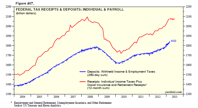 Last December, I wrote: “[M]y working hypothesis is that the fiscal cliff will be averted and there won’t be a recession next year.” I also predicted: “Averting the fiscal cliff could be very stimulative for the economy.” The cliff was averted, but the payroll tax rate was raised back to 6.2% from 4.2%, and marginal tax rates were increased for high-income taxpayers. Evidence is mounting that the economy is performing very well so far this year despite the tax hikes. The jury is out on the impact of the March 1 sequester, though that certainly hasn’t stopped the DJIA from rising to record highs over the past two days.